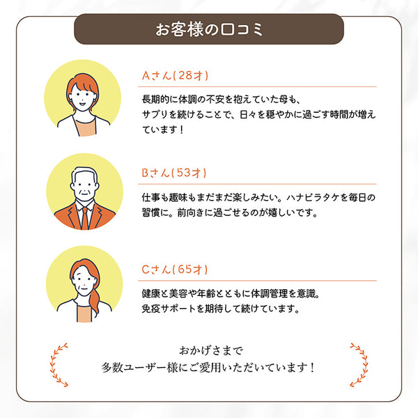 | 成分 | 還元麦芽糖水飴(国内製造)、ハナビラタケ微粉末、植物性乳酸菌/セルロース、ステアリン酸カルシウム、二酸化ケイ素 |